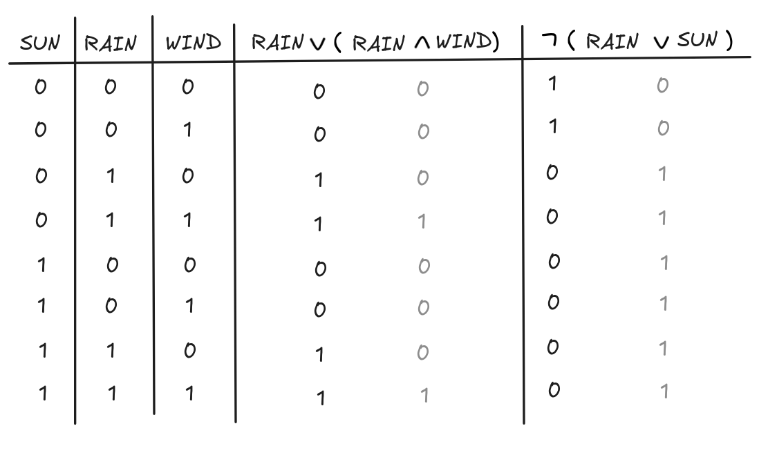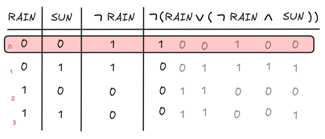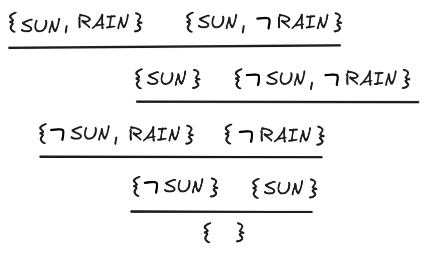 { SUN } { SUN, RAIN } { RAIN } { RAIN, SUN }But since there are no’s in this, we can not resolve and conclude that the formula is satisfiable, simply by setting v(SUN) = v(RAIN) = 1.