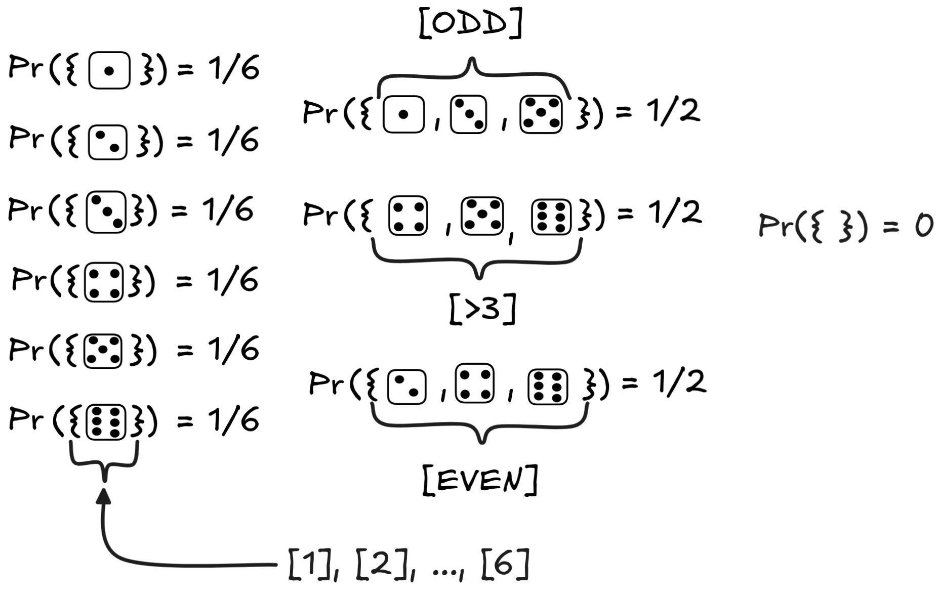 Note the crucial fact that P({ })=0 , where { } is the empty set with no elements, which corresponds to an impossible situation. The laws of probability theory dictate that { } has probability 0.