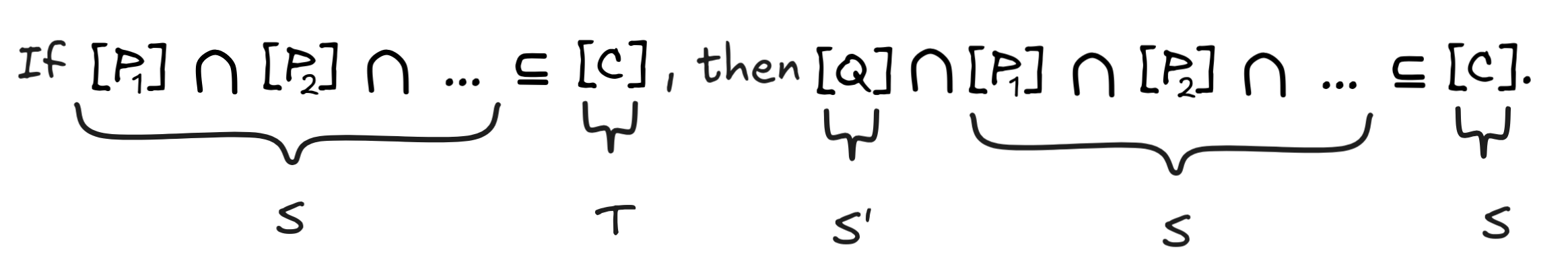 Applying the definition of deductive consequence in terms of subset and intersection, gives us: