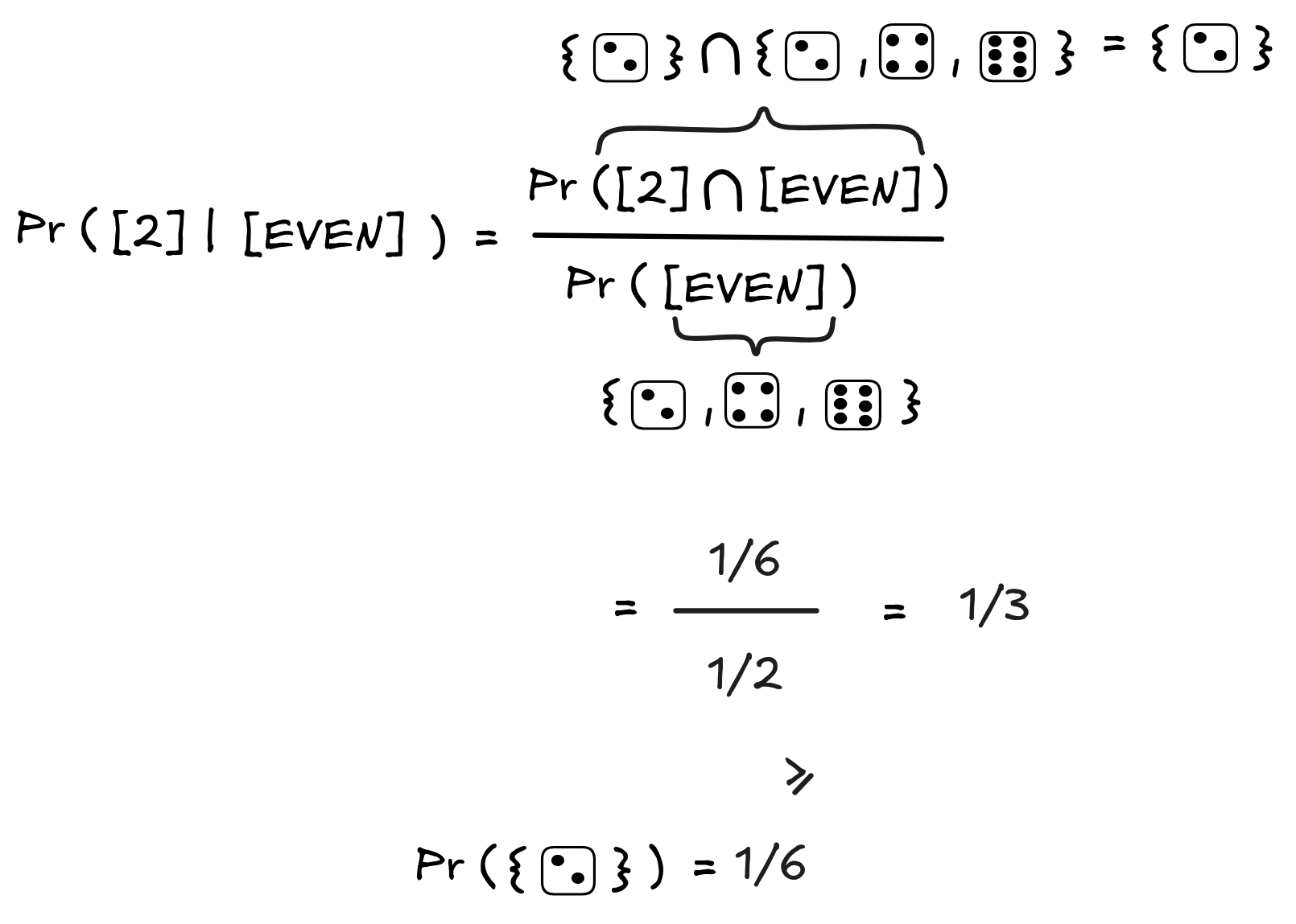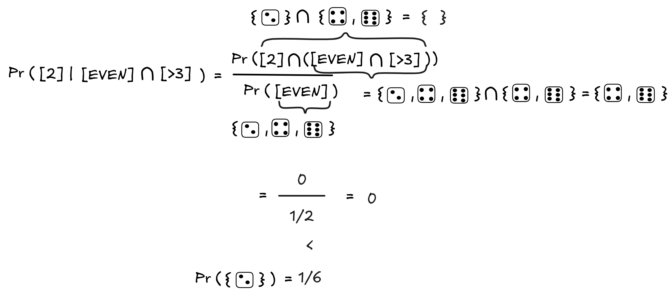 Note that the intersection of [2] and [EVEN] ∩ [>3] is empty: the result being two is incompatible with being an even result bigger than 3. This is why the result of the calculation is 0.