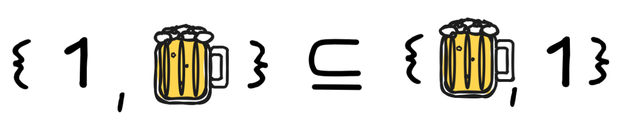 This claim is true, since both members of the first set—my beer and the number one—are members of the second set. In fact, both sets are the same!