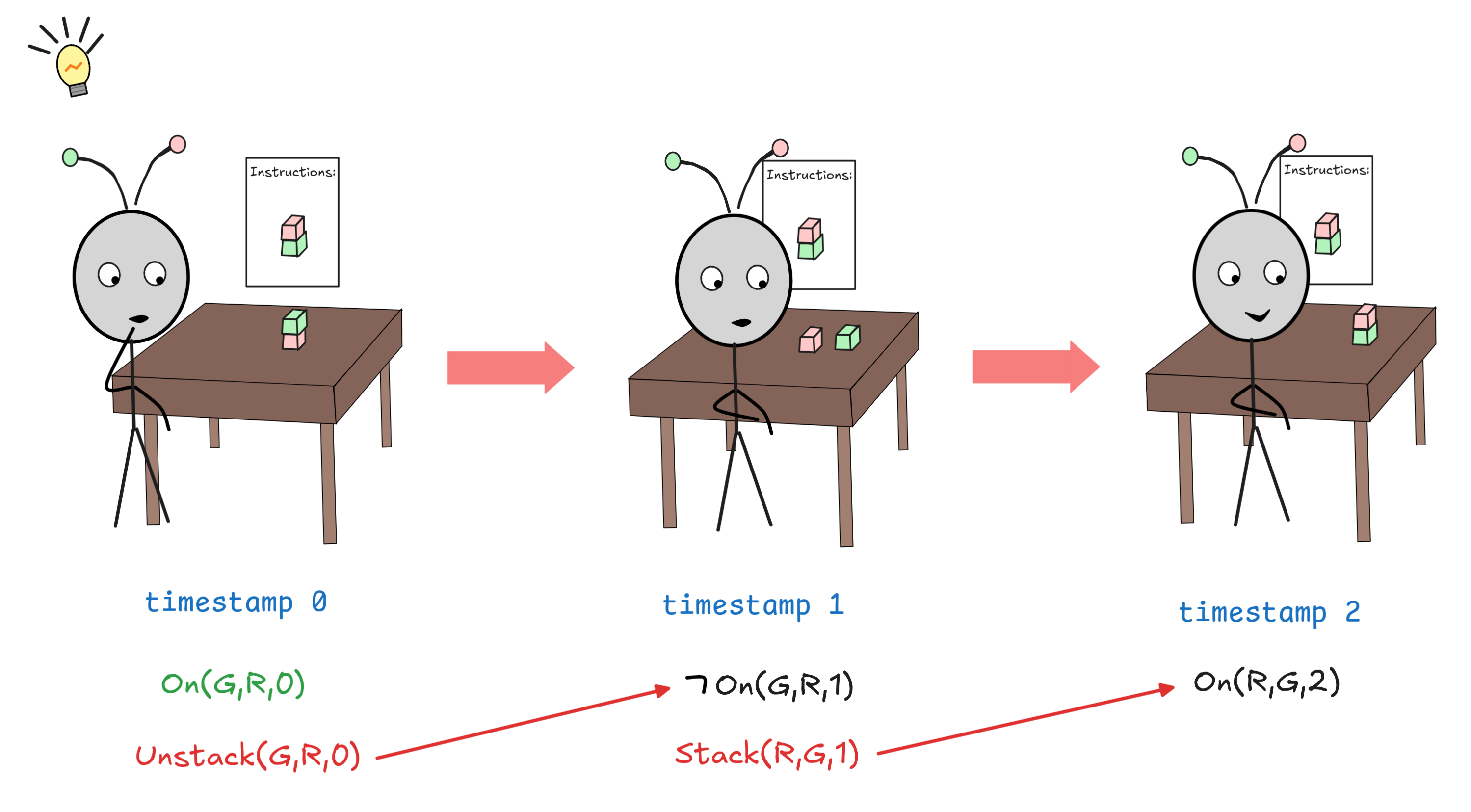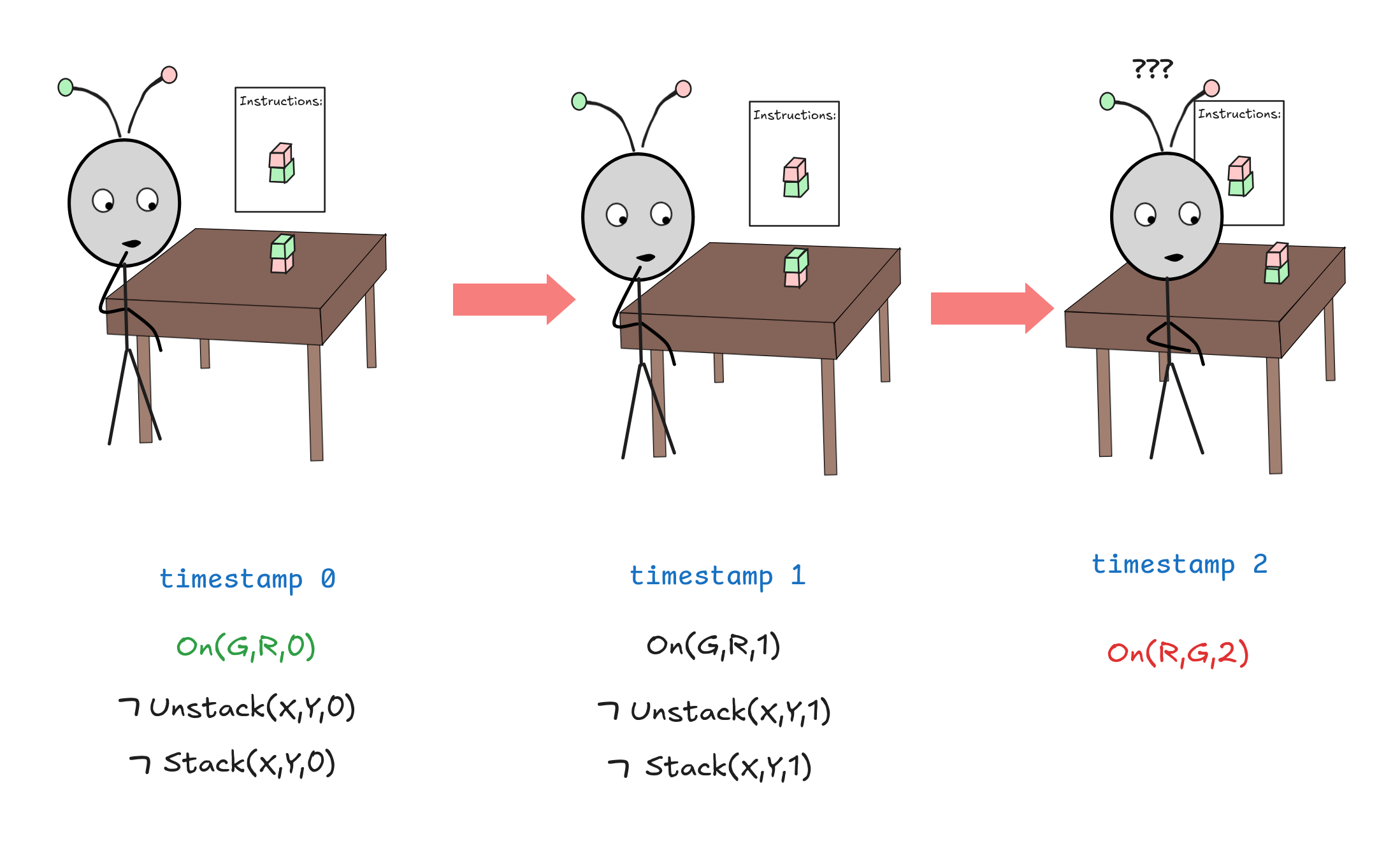 Stack(X,Y,t)for all X,Y,t as before. These express action principles like that if you stack at one time-stamp in the model, the action will succeed and the blocks will be indeed on top of each other at the next time-stamp.On(X,Y,t+1) Unstack(X,Y,t)