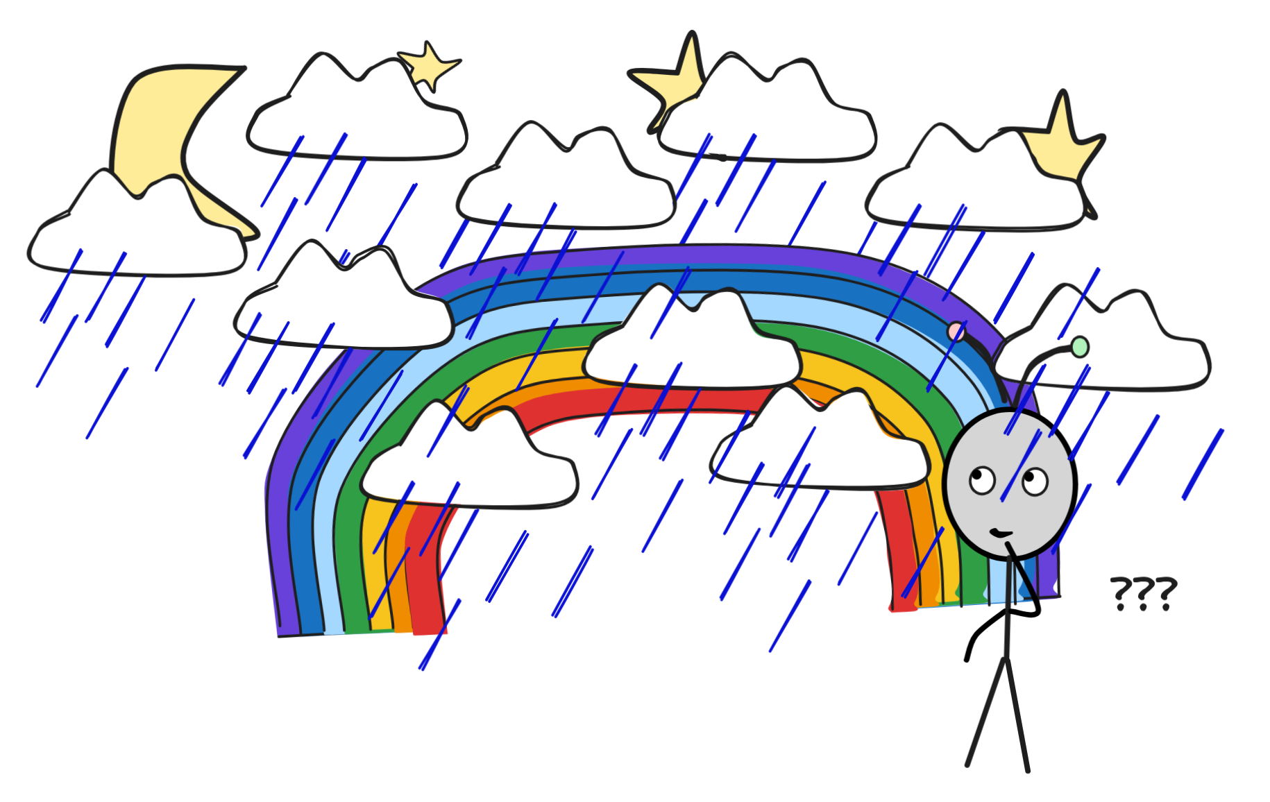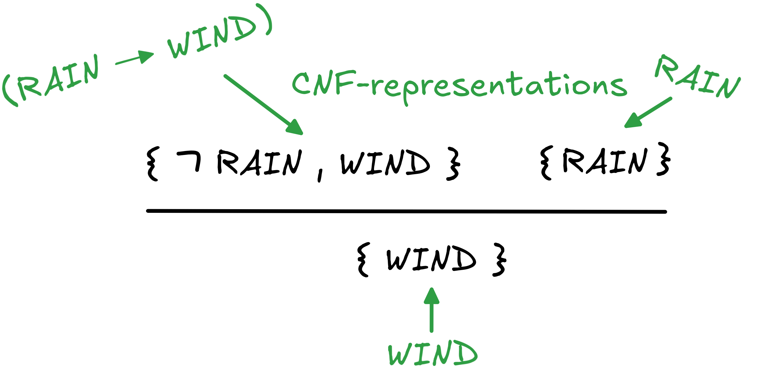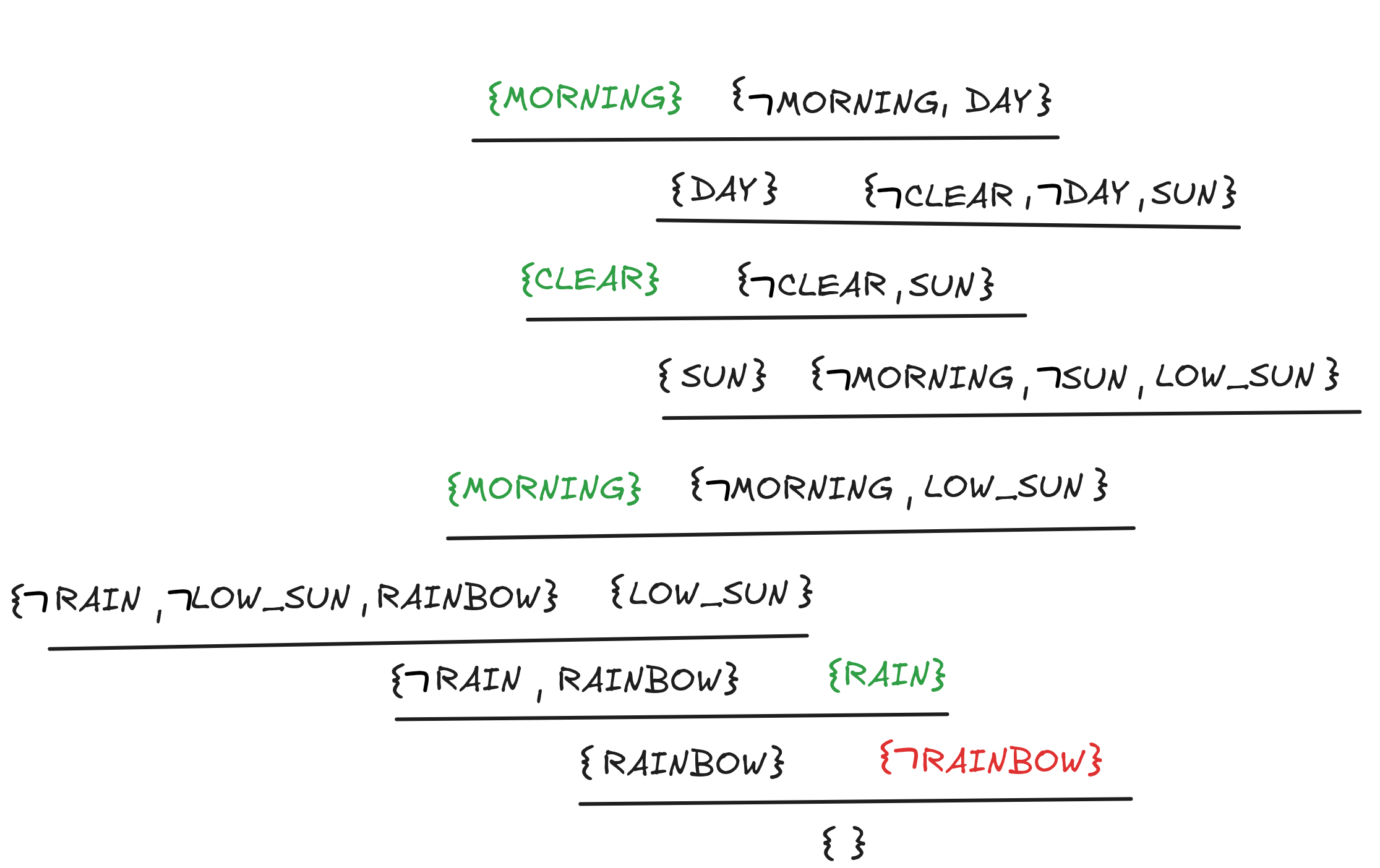 You might be wondering: What if we couldn’t have derived RAINBOW? For example, because we neither had MORNING nor EVENING as known facts. Would that have meant we don’t see a rainbow according to the KB? It turns out that’s a subtle question about the difference between being true and provable, or dually, false and unprovable. We’ll return to this question much later in the course, when we discuss many-valued logics and their motivations in AI.