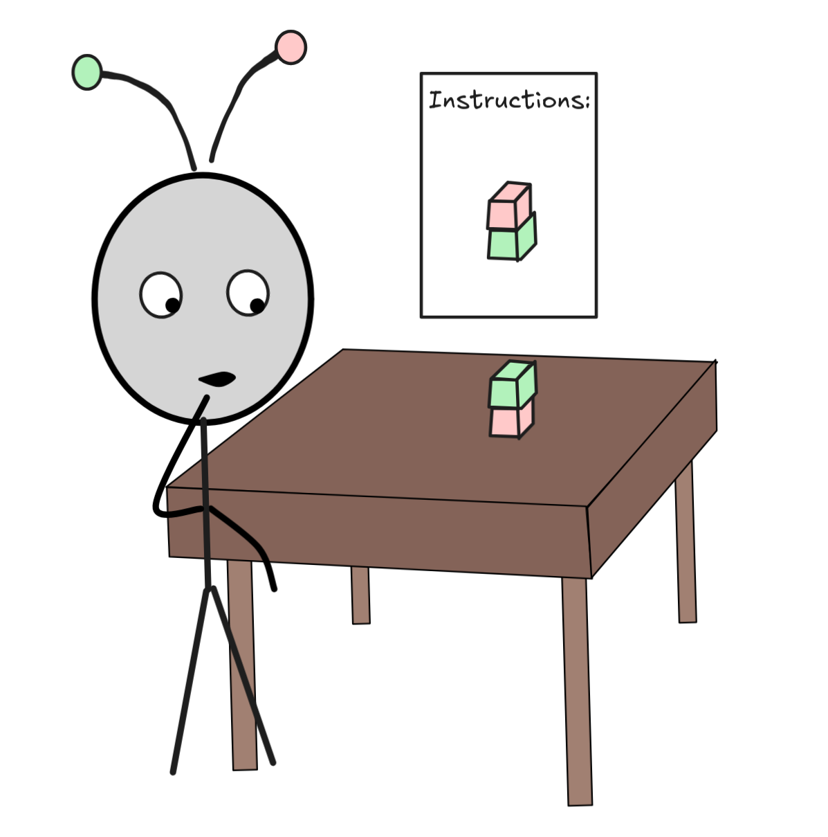 We begin by describing a very simple set-up: IA stands in front of a table, on which there are two blocks, a red one and a green one. The green block is stacked on top of the red one. There are instructions on the wall, telling IA to invert the stacking: