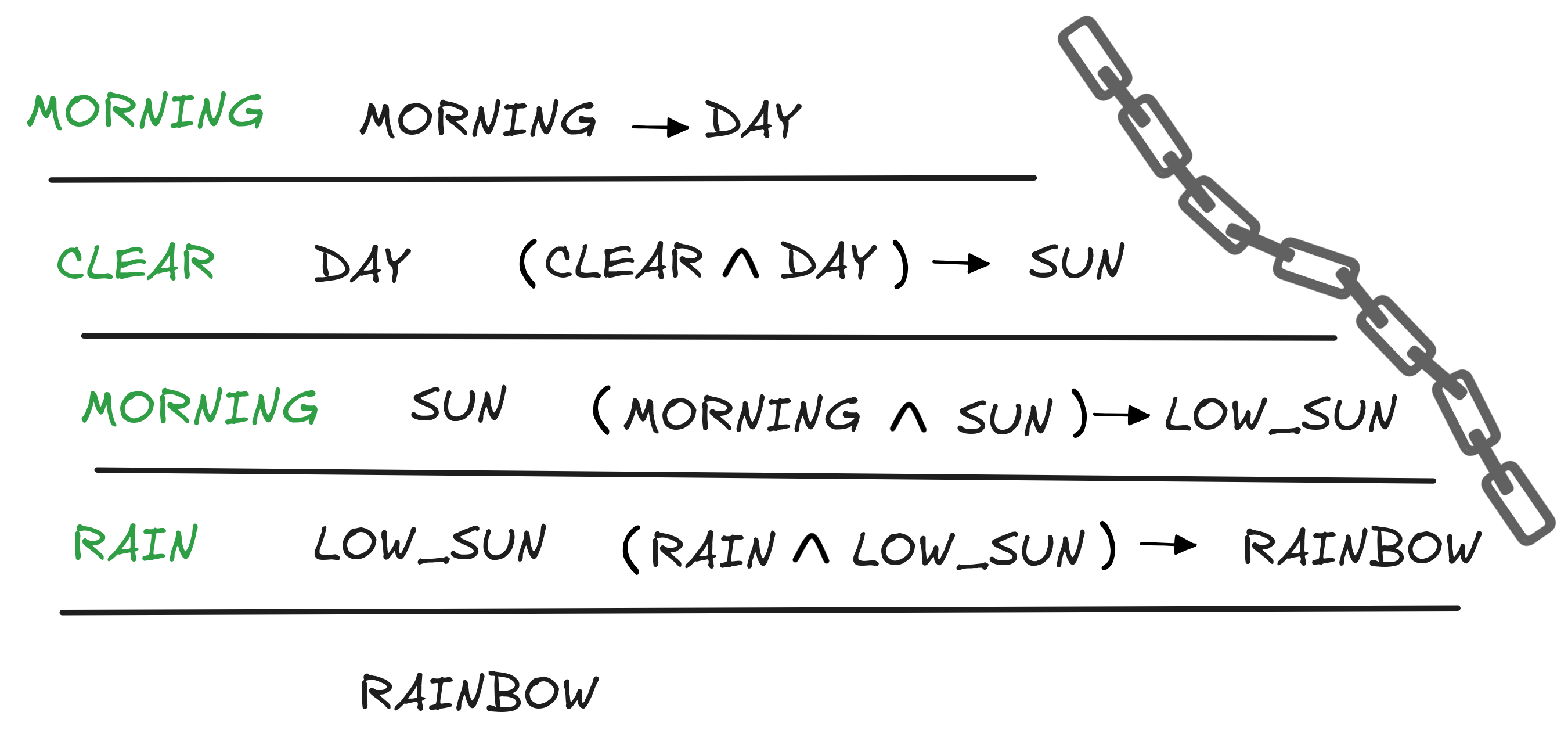 IA wants to know whether the goal, RAINBOW, follows from the known facts MORNING, CLEAR, and RAIN and the KB.