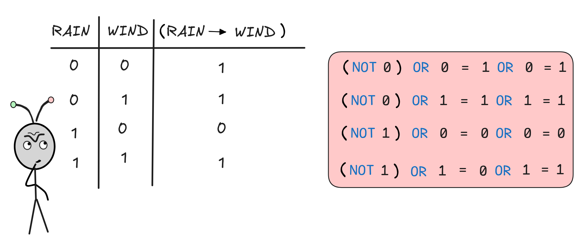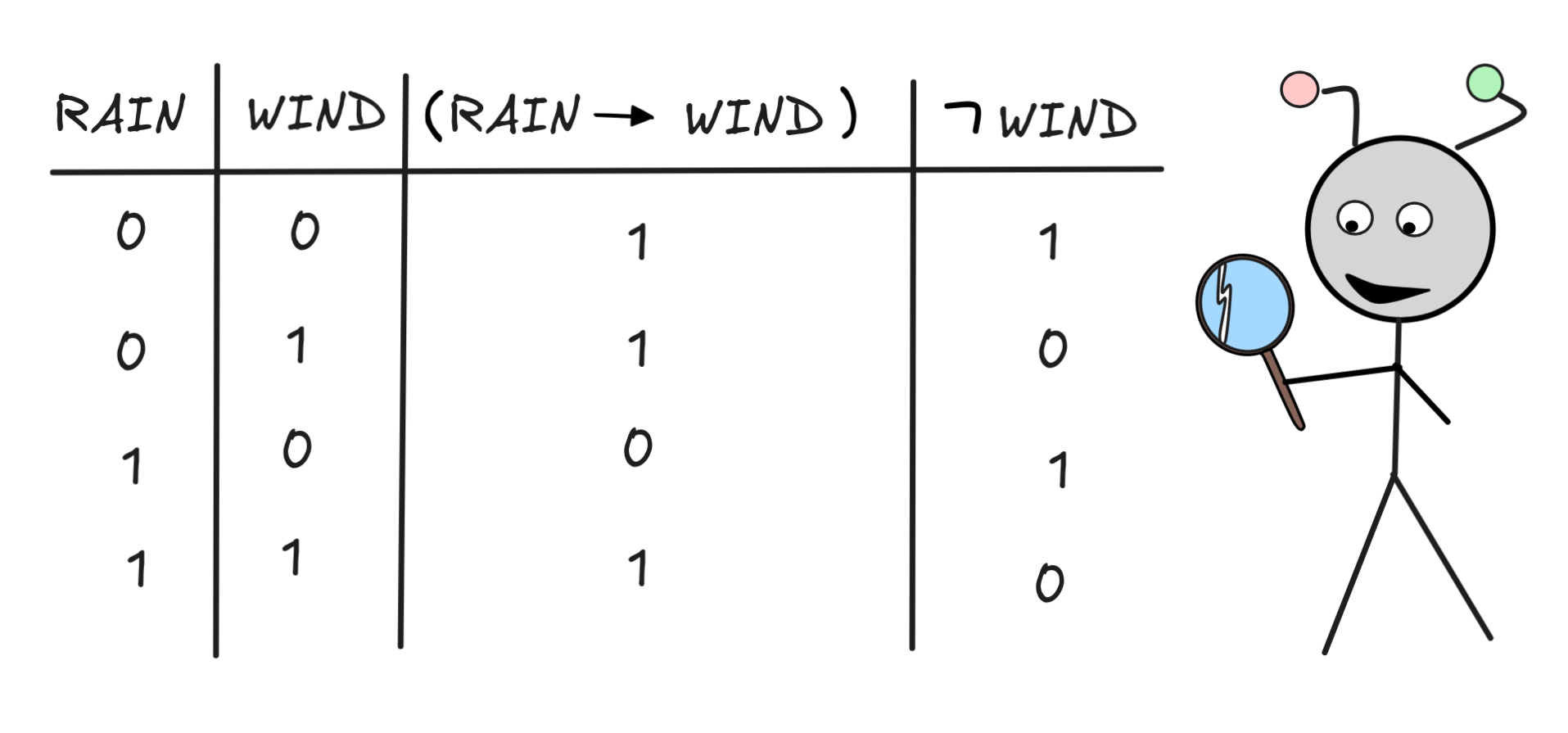 If the it’s raining and it’s not windy, that is v(RAIN) = 1 and v(WIND) = 0, the situation contradicts the conditional so it is not true, that is v(RAIN