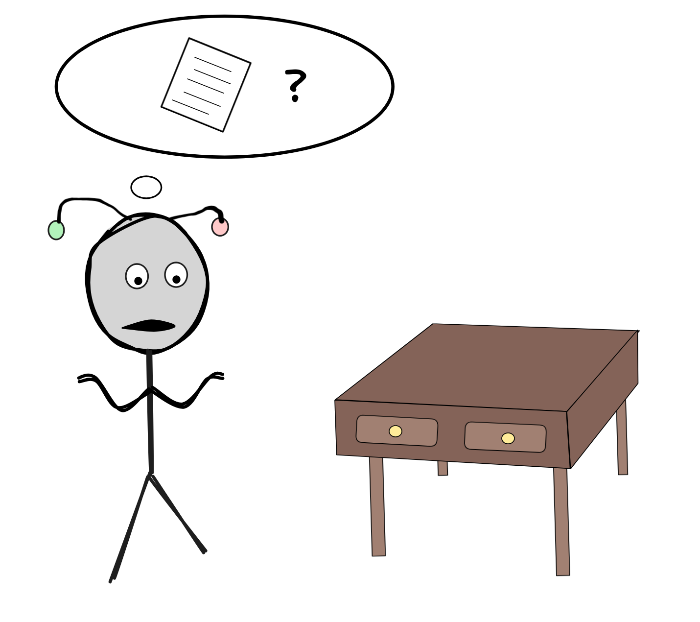 The idea is that we can represent basic facts about the world using logical formulas of a suitable language and rules as if-then statements between such statements. To illustrate, let’s consider a toy example. Suppose that our friend IA is looking for an important letter, which should be somewhere around this desk with two drawers: