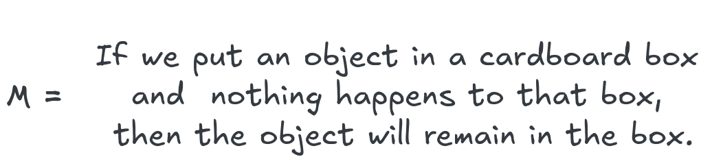Once more, modus ponens does not apply and we do not end up inferring that the rabbit is in the box. Another possibility is that the rabbit is still in the box. That is, we were right to apply modus ponens, but we are wrong in our observation that the rabbit is gone. (Perhaps the magician isn’t showing us all of the box?) Finally, and most interestingly, perhaps some people in the audience take this failure of modus ponens as evidence that M must be false. In other words, these people believe in magic.
