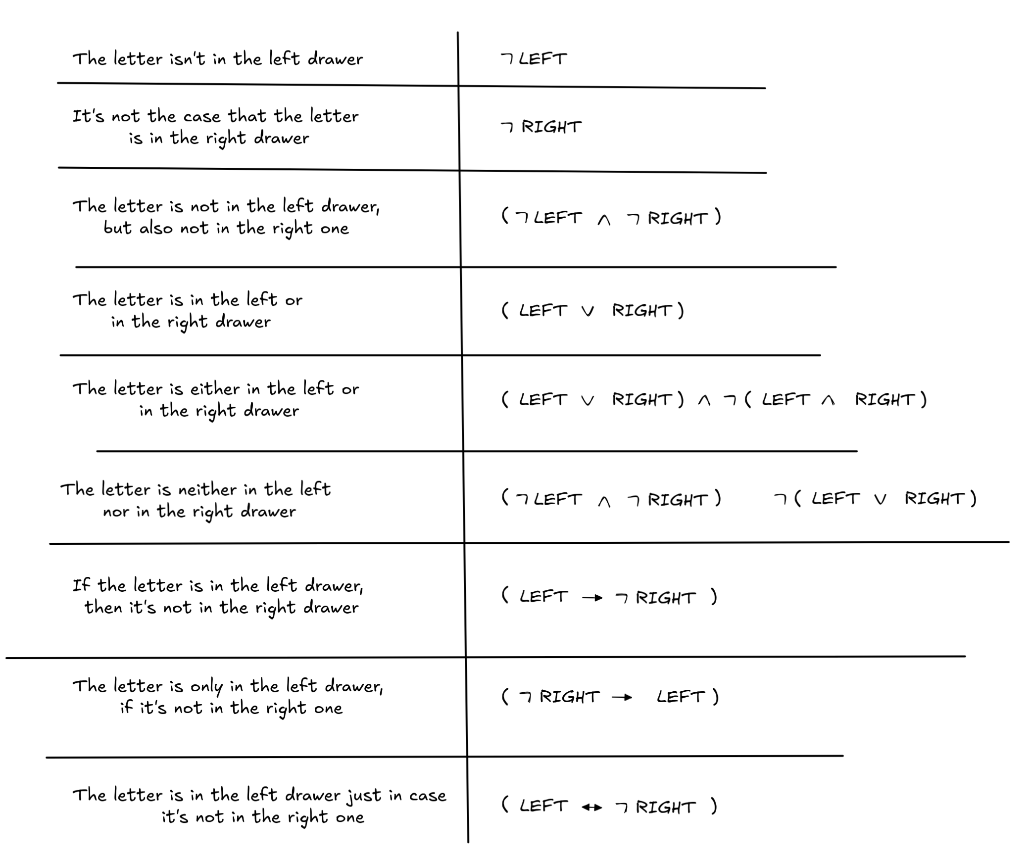 Suppose we have some information that we want to pass on to IA , who understands the language of propositional logic. Here are a few claims in natural language that we might want to convey, both in natural language and in the formal language of propositional logic, where we stipulate that LEFT is a propositional variable, which states that the letter is in the left drawer, and RIGHT is a propositional variable, which states that the letter is in the right drawer: