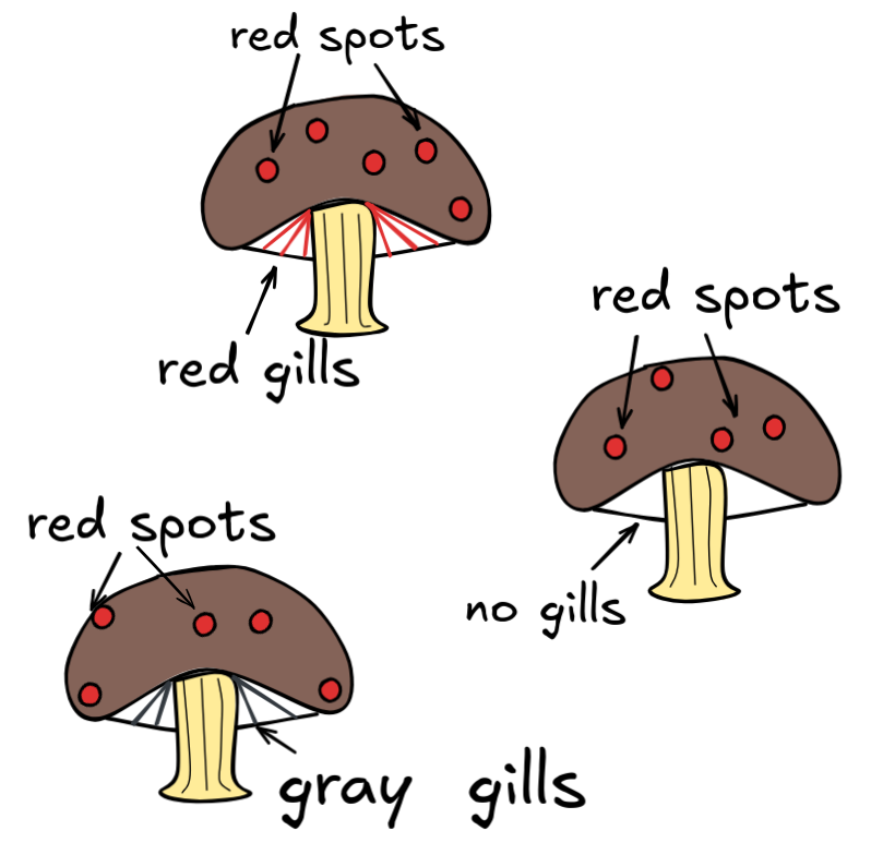 It is now clear what this means. It tells us what is the case when a mushroom has the features that are mentioned. Does this tell us anything about mushrooms that do not have red spots and red gills? For most people, the intuition is that it does not: on the basis of just S' I cannot conclude anything about a mushroom with black gills and no spots.
