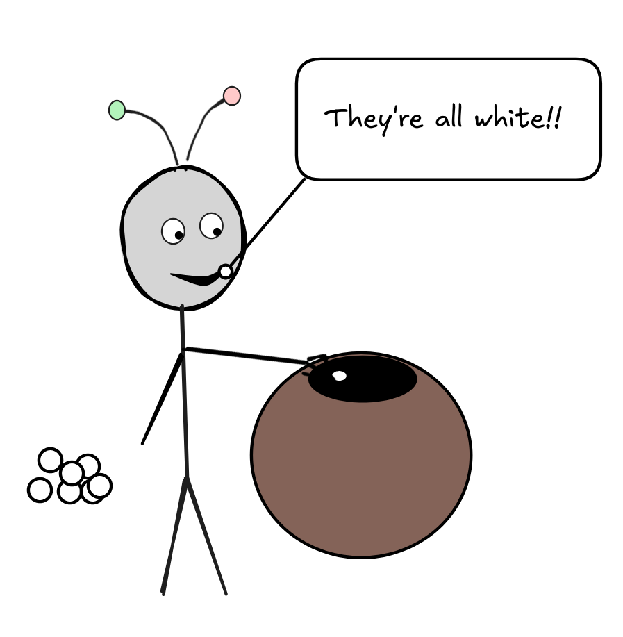 But isn’t there a sense in which the fact that all the swans we’ve observed were white does support the claim that all swans are white? Now, we know that there are black swans, so let’s take slightly modified inference. Suppose that there are a hundred marbles in this bowl. We can’t see inside the bowl and we can only take the marbles out one by one. We keep taking out marbles and they are all white. We’ve sampled the marbles randomly, we’ve taken them from the bottom of the bag, from the top, and so on. They’re always white.
