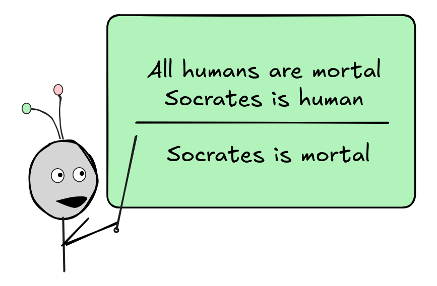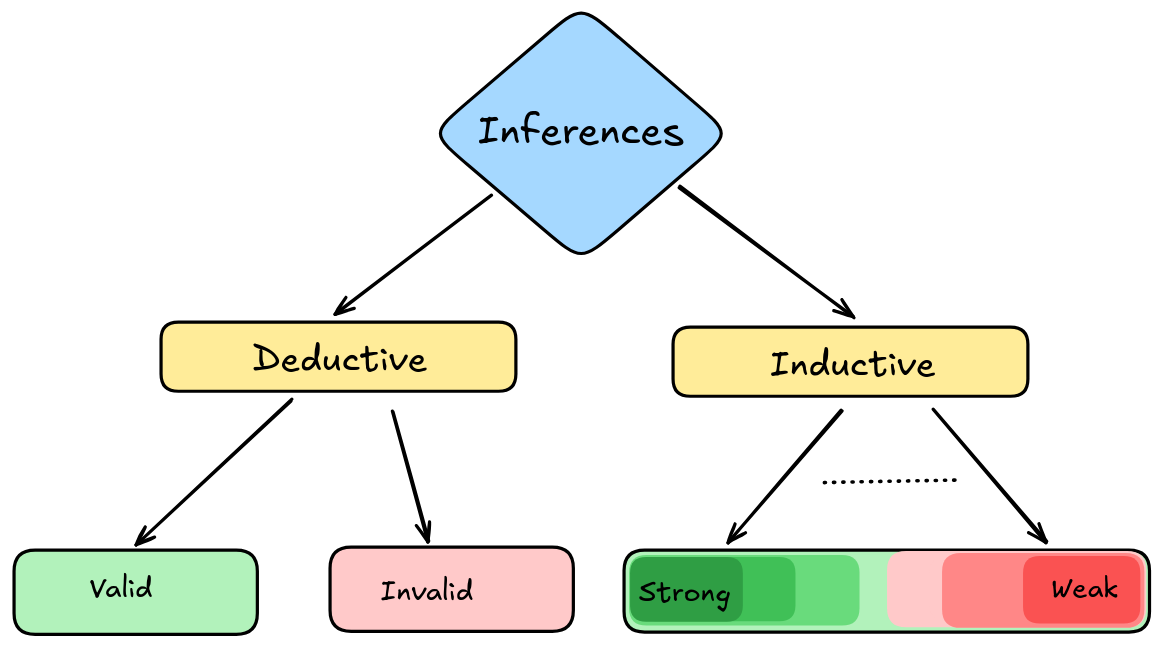 The first inference—the one about Socrates’ mortality—looks pretty solid. If all humans are mortal and Socrates is human, then he must be mortal. In logic, we call an inference like that, where the premises necessitate the conclusion, deductively valid. Deductive inferences are the traditional topic of most logical theory. They are often associated with mathematical reasoning.